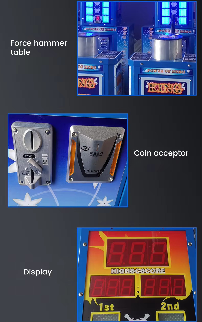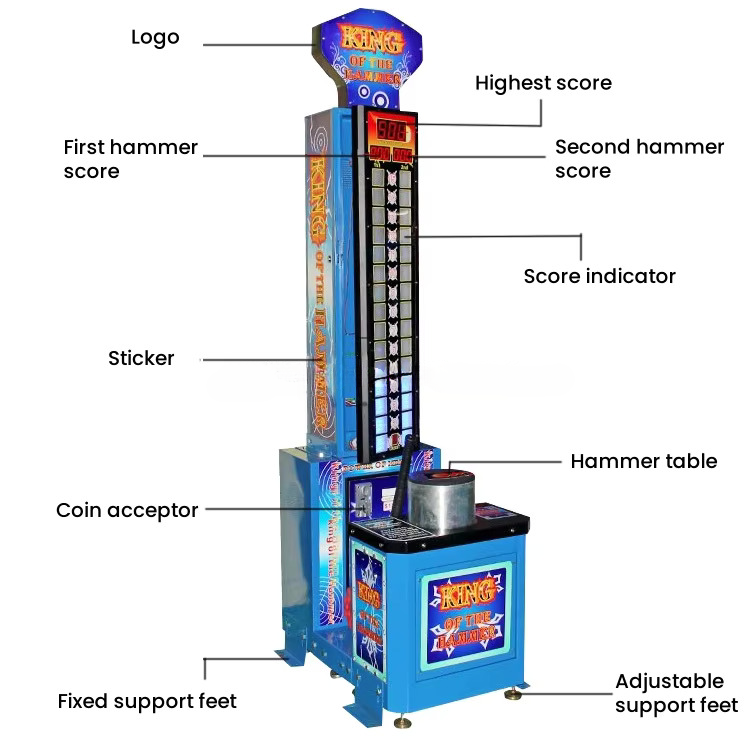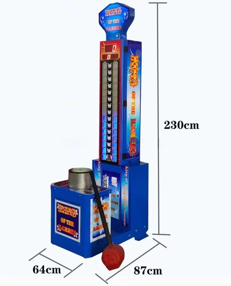 Hammer Hitting Game Machine is the ultimate coin-operated strength tester for arcades, carnivals, and sports bars! This high striker game challenges players to swing the hammer and ring the bell to win prizes. Built with a durable steel base, LED scoreboard, and automatic ticket dispenser, it’s perfect for competitive fun at parties, fairs, and entertainment centers. Test your power, redeem tickets, and become the strongest champion!"